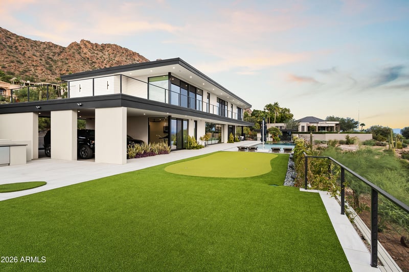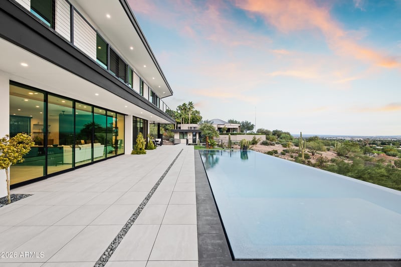 Listing details for 4725 56th St, Phoenix, AZ 85018 : This steel beam, glass and wood contemporary masterpiece, completed in July 2023 by Tiara Sun Development, sits on a sprawling 38,550 sq. ft. lot on a private street on the south slope of Camelback Mountain. Boasting 6,982 sq. ft. of luxurious living space, the home offers breathtaking city views framed by Camelback Mountain as a stunning backdrop. The property includes three en-suite bedrooms, a separate art studio, a media room/theater, a gym, and a bar/billiard room.