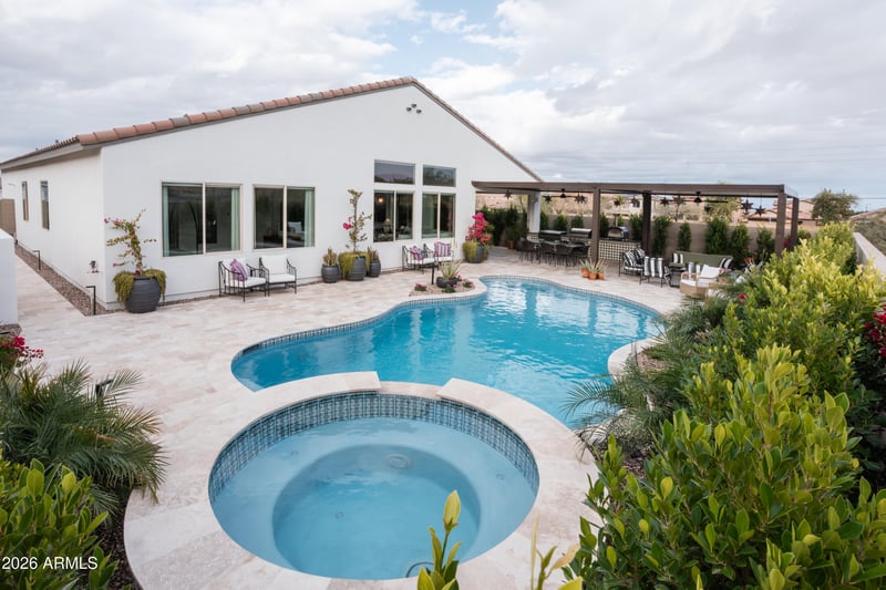 Listing details for 4783 Flat Iron Ct, Queen Creek, AZ 85144 : Breathtaking Desert Elegance at the Base of Gold Mine Mountain, this estate is designed with an unparalleled lifestyle defined by artistry, serenity, and panoramic views. This fully furnished stunning Mountain View Estate is nestled within the quaint and highly sought-after neighborhood of Borgata in Queen Creek. The backyard is a true masterpiece of bespoke design, centered around a resort-style saltwater pool and spa with custom Hand-Painted Artistry: The outdoor BBQ kitchen features one-of-a-kind, hand-painted tiles, specifically commissioned to perfectly match the gorgeous custom tile work within the pool and spa. Under the custom-built ramada, you'll find a premier outdoor kitchen featuring a pizza oven, Blackstone griddle, and a natural gas grill.