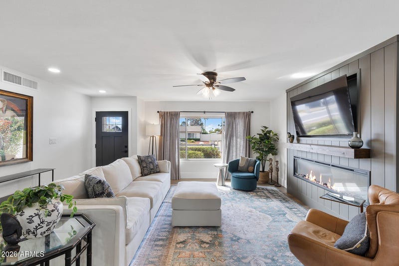 Listing details for 4932 Evans Dr, Scottsdale, AZ 85254 : Light-filled Central Scottsdale gem with NO HOA! LVP flooring flows through the main living areas; with a large formal living room off the front entry that opens seamlessly into the family room featuring vaulted ceilings, dining space & an upgraded kitchen with white cabinetry, quartz countertops, tile backsplash, stainless steel appliances, breakfast bar seating, walk-in pantry, plus a dining room buffet with wine rack & extra cabinetry for added storage. A large sliding door leads to the backyard, creating easy indoor/outdoor living. The primary suite offers direct backyard access, a double-vanity ensuite, walk-in shower & walk-in closet, while two good sized secondary bedrooms share an upgraded hall bath. Outside, enjoy a spacious covered patio with wood-like flooring, turf landscaping & block fencing, perfect for relaxing now or customizing later. Ideally located in Scottsdale within the Paradise Valley Unified School District, close to shopping, dining & recreation--this move-in ready home blends comfort, style & unbeatable convenience.