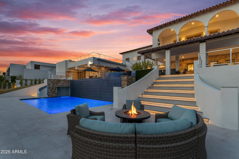 Listing details for 4937 Rockridge Rd, Phoenix, AZ 85018 : Privately gated on over 1.09 acres in prestigious Arcadia Proper -one of Phoenix's most sought after neighborhoods. The Rockridge Estate captures panoramic views of the city skyline and Camelback Mountain as its backdrop. A grand porte-cochère arrival leads to soaring, architecturally rich interiors, where a dramatic 15' wall of glass frames the view. The resort-style backyard is anchored by a two-level infinity-edge pool with a 10' water wall, grotto, and water slide. Spanning over 13,000 sqft, the estate offers 7 bedrooms, including two primary suites, 9 bathrooms, 5 fireplaces, an elevator, and expansive living spaces designed for elevated living and entertaining. The chef's kitchen serves as the heart of the home, appointed with Wolf and Sub-Zero appliances , dual cooking surfaces, and a curved run of custom cabinetry and quartzite countertops beneath a wall of windows. An expansive multi-level island, farmhouse sinks, and walk-in pantry are complemented by a secondary pantry, laundry, mudroom features, and dedicated dog spa.