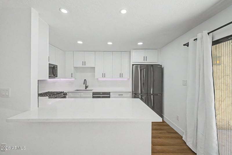 Listing details for 4950 Miller Rd #107, Scottsdale, AZ 85251 : Seize the chance to own this charming 2-bedroom apartment unit in El Chaparral Villas! Discover an inviting living room with a soothing palette, recessed lighting, stylish wood-look flooring, and a cozy fireplace for relaxing evenings. The well-appointed kitchen comes with solid surface counters, crisp white shaker cabinets, recessed lighting, a tile backsplash, stainless steel appliances, and a peninsula with a breakfast bar. The main bedroom has direct patio access, a convenient private bathroom, and a walk-in closet for an organized wardrobe. Enjoy quiet afternoons on the covered patio, perfect for enjoying a good book or a refreshing drink. The Community boasts a refreshing spa and pool and well-maintained common areas. Don't miss out on this one!