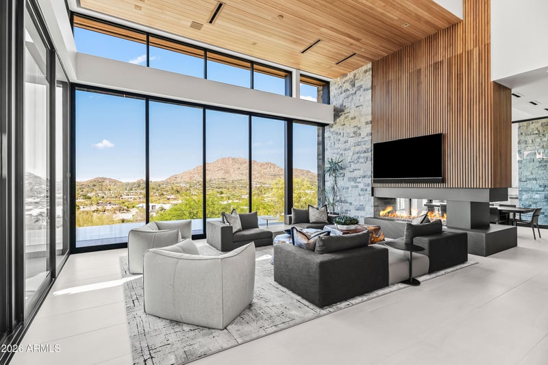 Listing details for 5002 Valle Vista Way, Paradise Valley, AZ 85253 : Perched on the iconic slopes of Camelback Mountain, this exceptional hillside estate by Brimley Development, designed by renowned architect C.P. Drewett, offers a rare blend of modern architecture and breathtaking natural surroundings in the heart of Paradise Valley. Capturing sweeping views of mountains, city lights, and golf courses, this striking two-story residence is defined by soaring ceilings, wood-paneled architectural details, and expansive walls of glass that seamlessly connect indoor and outdoor living. The great room is a true showpiece, featuring a dramatic stone accent wall, two-way gas fireplace, and retractable glass sliders that open to an infinity-edge pool wrapping the home--creating the ultimate Arizona indoor/outdoor lifestyle. The open-concept layout flows effortlessly into the formal dining area, wet bar, and chef's kitchen, ideal for entertaining. The gourmet kitchen is appointed with a rare Crystallo Quartzite island and backsplash, premium Sub-Zero and Wolf appliances, and a fully equipped butler's pantry with Miele coffee system. The luxurious primary suite offers a private retreat with its own patio and spa, along with dual vanities, separate water closets, a freestanding soaking tub, oversized steam shower, and a custom infrared sauna. Additional highlights include a private guest casita, elevator, home gym, bonus room, and a 3-car garage with ample additional parking. The resort-style backyard features an outdoor kitchen, completing this extraordinary desert estate. Just minutes from Arizona's top resorts, golf, dining, and shopping.