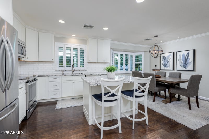 Listing details for 502 Kaler Dr, Phoenix, AZ 85020 : Located in the heart of the North Central Corridor, this beautifully renovated 4-bed, 3-bath home offers exceptional curb appeal with a stately covered entry, cobblestone walkway, stone veneer, and front patio. Designed for indoor/outdoor living, it features wood floors throughout, dual-pane windows, and a fantastic floor plan with two living areas, a wood-burning fireplace, and formal dining. The kitchen boasts white cabinetry, convection oven, island, and eat-in area. All bathrooms are tastefully remodeled. The primary suite includes French doors to the backyard. Enjoy a resort-style yard with 12-ft ficus hedge, oversized Pebble Tec pool w/ Baja shelf, flagstone patio, built-in spa & BBQ, covered patio, misting system & landscape lighting. Just steps to Murphy's Bridle Path!