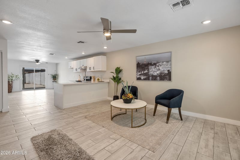 Listing details for 5046 41st Dr, Phoenix, AZ 85019 : Remodeled 3 bedroom home. Bright and open kitchen with white cabinets, quartz countertops, breakfast bar and stainless steel appliances. Tile throughout entire home including the bedrooms. Dual pane windows. Showers remodeled with custom tile. NO HOA. RV Gate. Large yard with covered patio. HVAC 2023. Roof replaced 2023