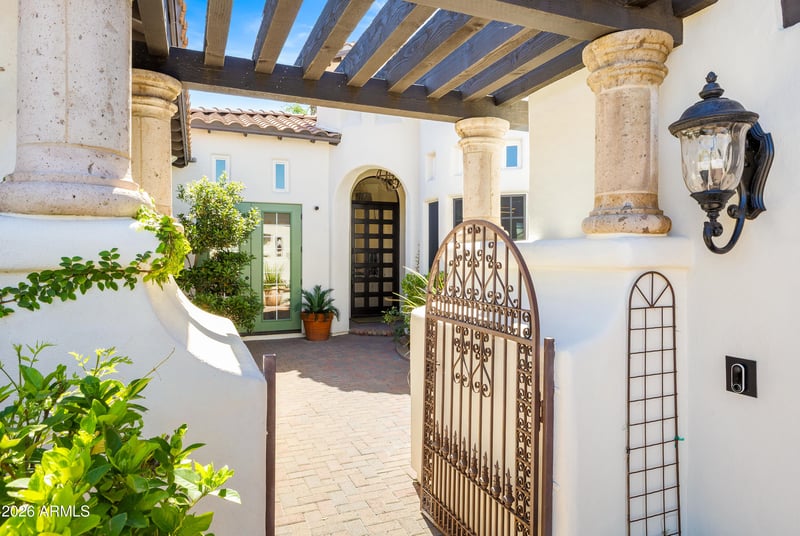 Listing details for 505 Adair Dr, Phoenix, AZ 85012 : This enhanced Contemporary Santa Barbara is the ''Crown Gem'' in the gated (only 10 homes} community of Adair Manor. Ideally located siding to the private community park with direct access from the garage. Beyond charming lush courtyard greets you at the front entrance with a wood burning FP seating area and access to a seperate attached casita with customized built-in cabinetry, walk-in closet and a full bath. Enter the main house through a custom 9ft bevelled glass door into an architectural wonderous experience of 17ft ceilings with beautiful light through stunning windows, french doors and updated light fixtures. Entertainment wet bar and large formal dining room. Wide plank white oak wood floors flow beautifully, designer touches and an impressive 70'' gas FP. Kitchen and breakfast- nook display courtyard and park views. Granite counters gas range, SS appliances, coffee bar & pantry. Primary bedroom has luxurious limestone bathroom and closet built ins. Guest bed and bath plus an office w/ windowed alcove & built in bookcases. Intimate backyard with stone walls, planters, BBQ and Gazebo.