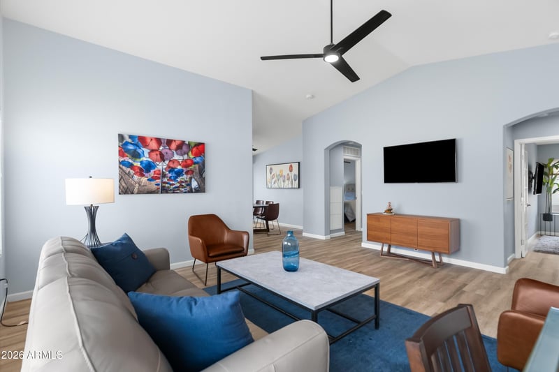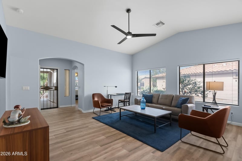 Listing details for 5091 Peachwood Dr, Gilbert, AZ 85298 : Pristine Trilogy home with many updates! Absolutely immaculate light & bright home with soaring vaulted ceiling in the great room with large light filled windows. This home lives large with 3 bedrooms (or 2 bed + den) & 2 baths. Enjoy the gorgeous AZ lifestyle whether this is a vacation home or year around living you will enjoy this home situated across from 1 of the many community parks.Kitchen features granite counters & stainless appl.Some of the updates include new roof-2025, new HVAC 2022, wood look Porcelain tile floors through out -2021,great bathroom updates, RO system-2023, Ext paint-2023.New water heater 2026, citrus trees.Wonderful amenities, pools, spa, pickleball, tennis, golf, bocce ball, clubs, restaurant, fitness center too. Onsite restaurant/bar. Close to shopping & dining