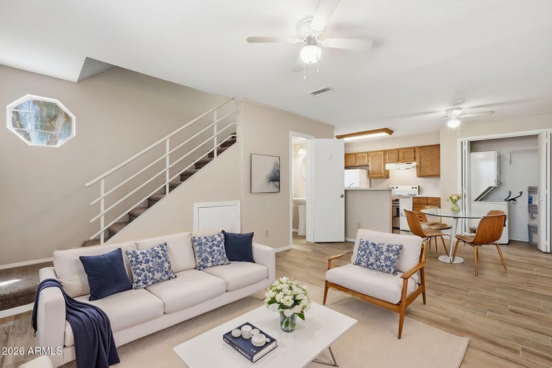 Listing details for 510 Alma School Unit 184 Rd #184, Mesa, AZ 85201 : Welcome to this cute and conveniently located end-unit townhome offering comfort, style, and added privacy. Step inside to find new wood-plank tile flooring downstairs and brand-new carpeting upstairs, creating a fresh and modern feel throughout. The open-concept kitchen flows seamlessly into the living and dining area, perfect for everyday living and entertaining. Inside laundry with washer and dryer included adds ease and functionality. Both bedrooms are located upstairs, along with a full bathroom, while a half bath downstairs is conveniently situated for guests. The private and spacious patio is ideal with the end unit offering additional privacy and natural light. A wonderful opportunity to own a townhome in a great location--don't miss it!