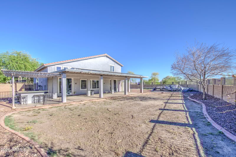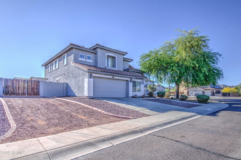Listing details for 516 219th Dr, Buckeye, AZ 85326 : Spacious 5-bedroom, 3-bath home in the desirable Windmill Village community near parks, walking trails, and golf amenities. The functional layout includes a primary suite and additional bedroom on the main level, ideal for guests or multigenerational living. Upstairs features a large loft perfect for a game room, media space, or second living area. The primary suite offers a separate tub and shower with a walk-in closet. Tile and wood flooring enhance the main living areas, complemented by fresh interior and exterior paint. The oversized lot features an extended covered patio, RV access, outdoor cooking area, firepit, garden space, and convenient access to schools, shopping, and freeways.