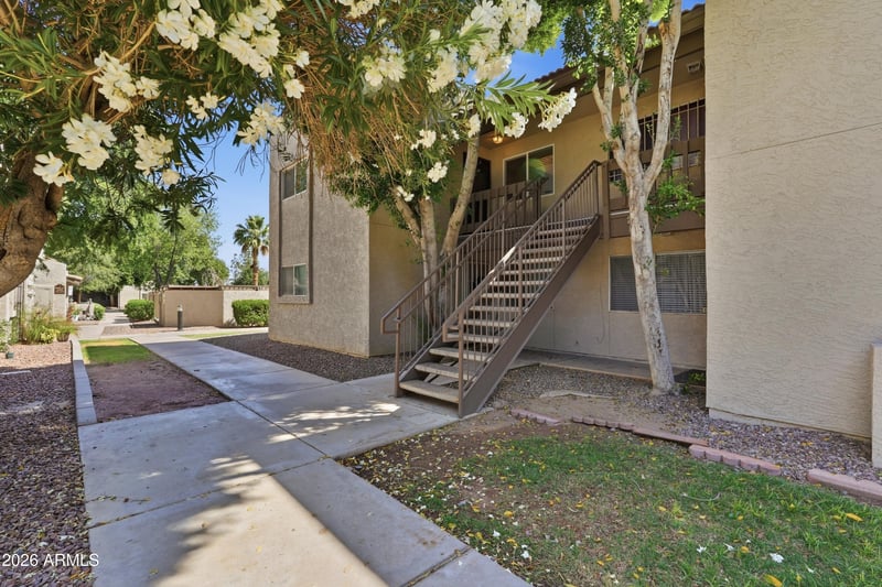 Listing details for 520 Stapley Dr #227, Mesa, AZ 85203 : FHA approved! Premium upper-end unit with direct pool views from your private balcony, just steps away. Light-filled interior with an open layout and split floor plan, featuring wood-look flooring, updated dual pane windows and patio door, neutral tones, recessed lighting, and ceiling fans. The living area opens seamlessly to the balcony, creating ideal indoor/outdoor flow. Kitchen offers granite countertops, breakfast bar, ample cabinetry, and newer stainless steel appliances. Both the primary suite and split second bedroom feature walk-in closets. Newer stacked washer/dryer and refrigerator convey. Located near Mesa Community College, ASU, spring training facilities, shopping, dining, and entertainment. Low-maintenance living in a prime location!