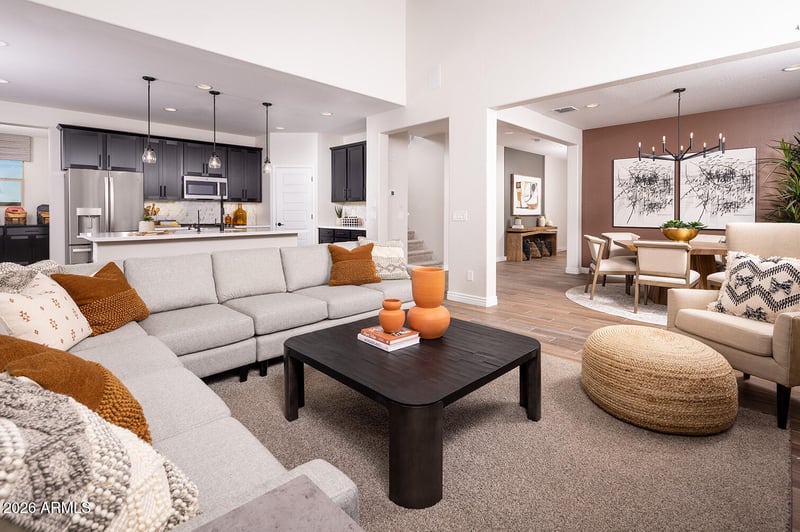 Listing details for 5209 Top Hand Trl, Laveen, AZ 85339 : Welcome to this exceptional two-story home offering 4 bedrooms plus a den, 2.5 bathrooms, and an impressive 3-car garage with RV garage, designed for both comfort and versatility. The paver driveway adds standout curb appeal, while custom interior paint sets a polished tone throughout the home. Inside, the open floorplan creates a seamless flow between living spaces, perfect for everyday living and entertaining. The kitchen is the heart of the home, featuring a large Quartz island, stainless steel appliances, and a tiled backsplash, providing both style and functionality. The spacious primary bedroom serves as a relaxing retreat with an en-suite bath that includes a dual-sink vanity. A dedicated laundry room offers added convenience with extra storage and a utility sink. Step outside... to the backyard oasis, complete with a sparkling pool and covered patio, ideal for enjoying outdoor living year-round. With flexible living spaces, upscale finishes, and exceptional garage options, this home is perfectly suited for modern living and entertaining.