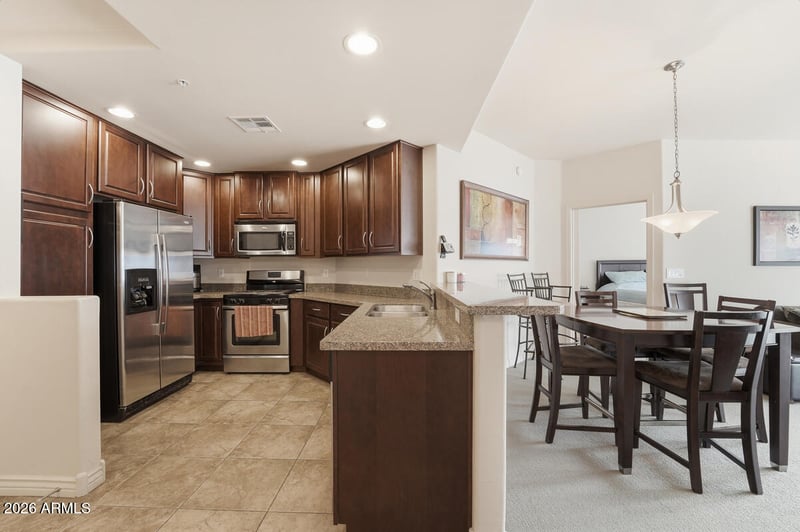 Listing details for 5350 Deer Valley Dr #4401, Phoenix, AZ 85054 : Welcome to your new home. This top-floor, condo includes 2 bedrooms, 2 bathrooms, a private patio, Newer washer and the AC unit was replaced in 2023. 2 underground parking stalls with a storage cage, among other features. Situated in Toscana of Desert Ridge, a luxurious, resort-style community, it offers 3 swimming pools, 3 clubhouses, billiards, a game room, and 2 large fitness centers, all secured by a gated entry with a guard and equipped with BBQ areas throughout. The location is ideal, just 2 blocks from High Street/City North and near Desert Ridge Mall, providing excellent shopping and dining options. Furthermore, it is conveniently close to the 101 freeway, only minutes away from the Mayo Clinic, Scottsdale Airpark, and Downtown Phoenix.