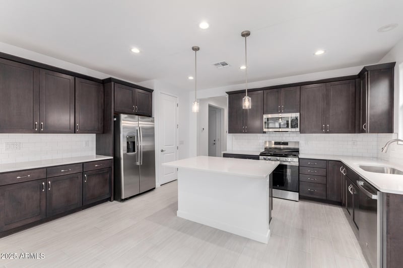 The bright, open layout is enhanced by luxurious dark Cabinets, quartz countertops, wood look tile flooring, and elegant nickel hardware, creating a welcoming and stylish interior.