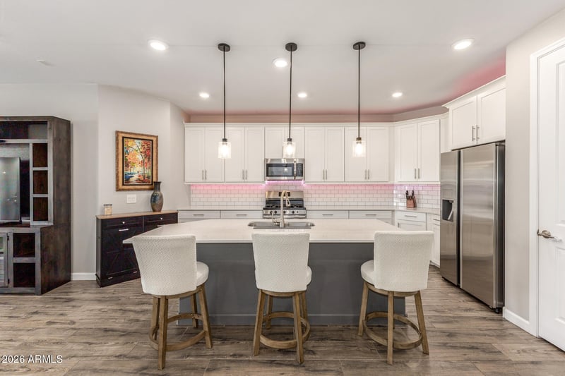 Listing details for 542 Rainbow Bridge Ln, San Tan Valley, AZ 85140 : Better than new, open floorplan, highly upgraded move-in ready home near Queen Creek shopping, restaurants and more! Gourmet kitchen w/ gleaming quartz counters, white cabinets, stylish backsplash, led undercabinet lighting, large island w/ breakfast bar, pantry, SS appliances including gas range!! Primary suite has built-in storage, luxurious and beautiful bath. Backyard is private backing green space and boast an extended patio, firepit area and grassy area. Priced to sell!!