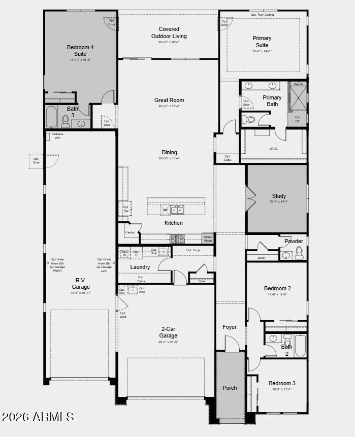 Listing details for 5425 Coplen Farms Rd, Laveen, AZ 85339 : What's Special: RV Garage | Large Kitchen Island | North Facing Lot | Dedicated Study. New Construction - July Completion! Built by America's Most Trusted Home Builder. Welcome to the Overland at 5425 W Coplen Farms Road in Salero at Laveen Vistas Journey Collection! Spacious and inviting, this thoughtfully designed home welcomes you through a charming foyer flanked by two bedrooms and a full bathroom. Just outside the dedicated study, a convenient powder room and nearby laundry room add ease to everyday living. At the heart of the home, open-concept living shines as the great room flows seamlessly into the casual dining area, kitchen with an island, and a covered patio perfect for entertaining with ease. One side of the great room features a private secondary bedroom with an ensuite bath, ideal for guests. Tucked away on the opposite side, the primary suite offers a peaceful retreat with a roomy walk-in closet and a beautiful primary bath. Completing the home are a two-car garage and a spacious RV garage, adding both function and flexibility. Salero Journey Collection offers a warm, welcoming neighborhood atmosphere just minutes from South Mountain Park, giving you effortless access to the desert's natural beauty. Its prime location near the Loop 202 South Mountain Freeway also provides quick, convenient connections to major destinations throughout the Valley. Additional Highlights Include: bed 4 suite and bath 3 in place of flex 2, study in place of flex, garage service door, double gate in place of standard, lite glass interior doors at study in place of flex, RV garage entry to interior, gourmet gas kitchen, ceiling fan pre-wires at bedrooms, great room, study, and covered patio, EV pre-wire at 2-car garage, engineered marble counters at secondary baths, AV sleeve at great room, engineered marble super shower at primary bath, tiled kitchen backsplash, pots and pan drawer, raised vanity at bath 2 & 3, recycle center at kitchen, comfort height toilets at all baths, upgrade carpet and tile, pre-plumbed for water softener, and gas line for future outdoor kitchen. MLS#7016869