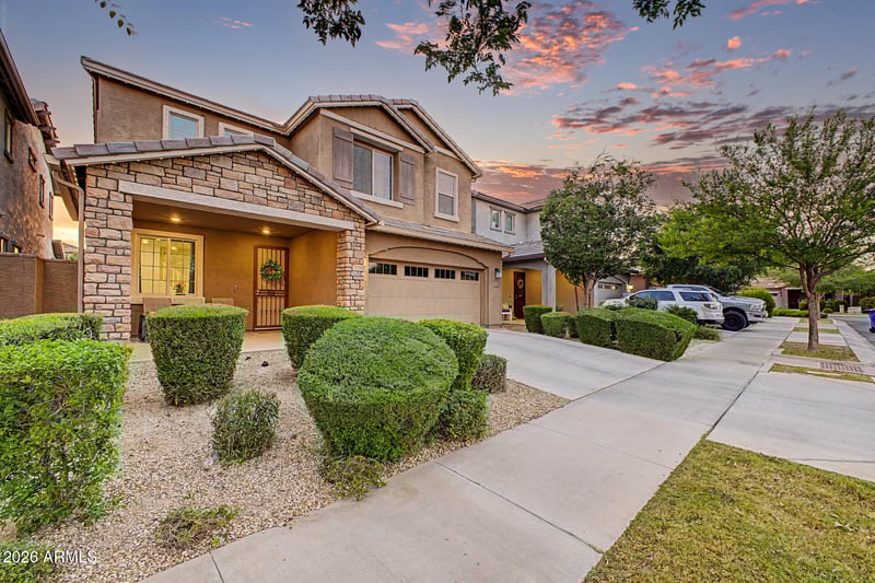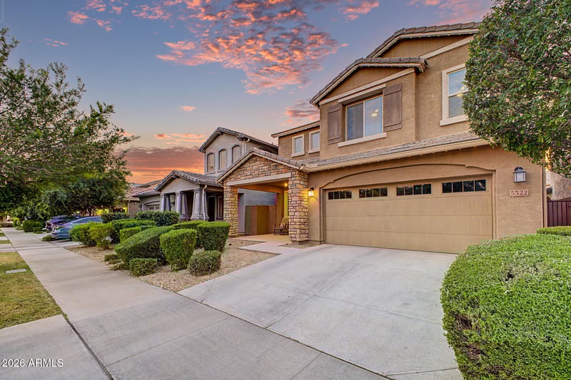 Listing details for 5522 Vincent --, Mesa, AZ 85212 : This beautifully maintained two-story single-family home, built in 2019, is ideally situated on a premium 5,375 sq. ft. lot directly across from Tupelo Park, offering scenic views and immediate access to a family-friendly outdoor space. Boasting 5 bedrooms, 3 bathrooms, and a 2-car garage, this home features a spacious, functional layout designed for both comfortable everyday living and effortless entertaining. With no other 5-bedroom homes currently available in the immediate area, this property presents a rare and highly desirable opportunity. PREMIUM LOT, EXTENSIVE UPGRADES AND STANDOUT FEATURES all across from the PARK. SEE MORE... The backyard is thoughtfully designed with low-maintenance desert landscaping, including pavers and turf, creating an inviting outdoor retreat perfect for relaxing or hosting gatherings year-round. The home is equipped with a whole-home water conditioning system by H2O Concepts, along with permanent LED exterior lighting by Trimlight. Ceiling fans by Fanimation with integrated light dimmers are installed in all five bedrooms and on the backyard patio, enhancing comfort and energy efficiency throughout. The garage has been fully upgraded for both functionality and style, featuring a Genie StealthDrive Connect 1-1/4 HP belt-drive Wi-Fi garage door opener with Aladdin Connect, new Wayne Dalton door springs, a Monkey Bars storage system, a built-in floor-to-ceiling workbench for maximum storage and workspace, and durable chipped epoxy flooring. An additional hose bib in the garage is connected to the home's H2O Concepts water conditioning system, providing convenient access to conditioned water for cleaning and projects. The interior is finished with semi-gloss paint for easy cleaning and added moisture resistance. Inside, custom design elements add warmth and character throughout the home, including shiplap accents on the family room media wall and kitchen island, as well as a barn door in the loft for added privacy. A Steel Advantage security screen door enhances both curb appeal and airflow while providing additional security. With its prime location across from the park, modern upgrades, and thoughtfully designed features, this home offers an exceptional blend of comfort, convenience, and value.