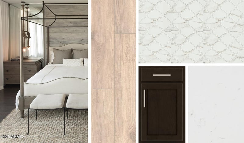 The primary suite offers a peaceful retreat tucked away in the back of the home with ample space, and the en-suite bathroom features satin nickel finishes, dual sinks, quartz countertops and ample storage.
