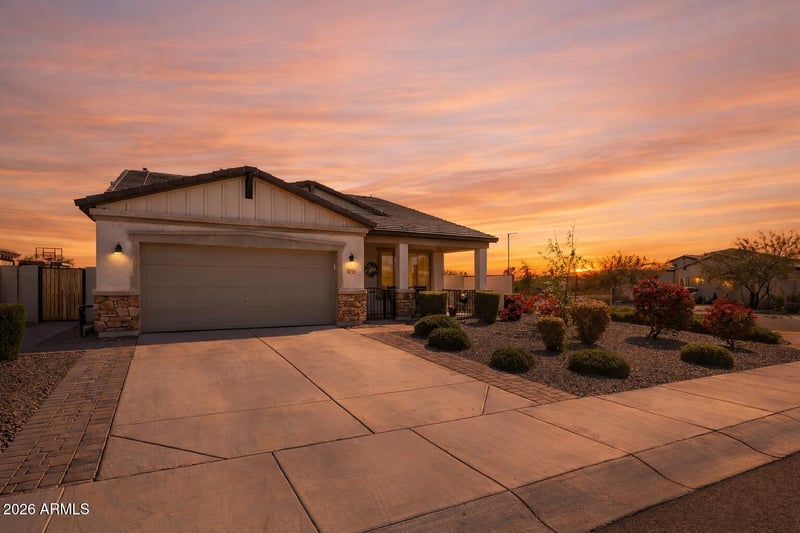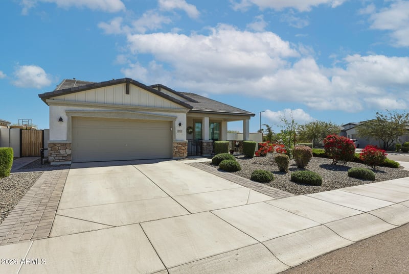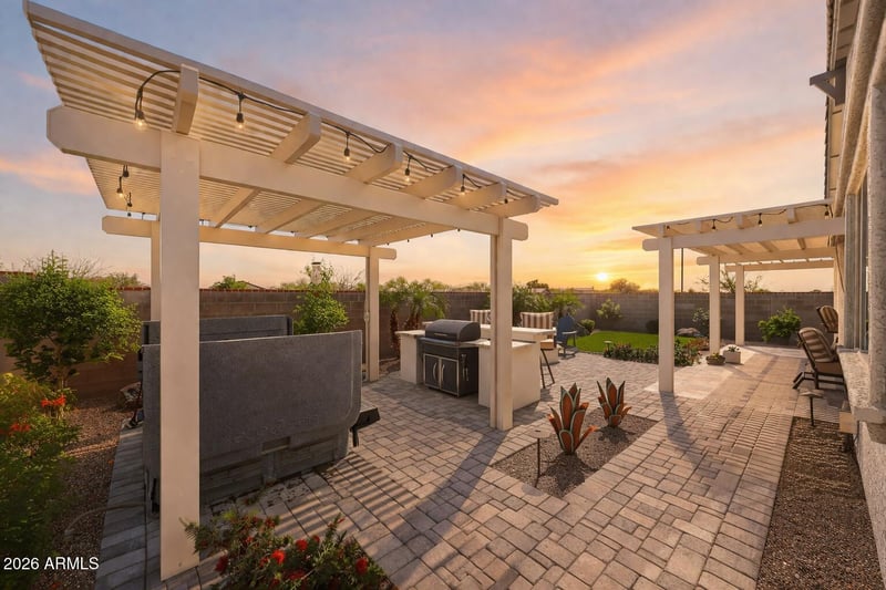 Listing details for 5711 187th Ln, Litchfield Park, AZ 85340 : Welcome to this impeccable home with over $150k+ in upgrades in Litchfield Park. Built in 2021, this highly upgraded home offers the perfect blend of modern style, with thoughtful upgrades throughout. The open kitchen featuring upgraded white cabinetry with hardware, quartz counters, tile backsplash, pendant lighting, and a layout ideal for both everyday living & entertaining. Details like plantation shutters, chic lighting, and a shiplap accent wall create warmth and character. Owned solar helps keep utility costs low, making this home as practical as it is beautiful. Ideally situated with only one side neighbor & no neighbor behind you. Step outside to your oasis complete with Dual ramadas, extended patio, turf, BBQ station, firepit, side-yard garden & a soaking hot tub on a corner lot!