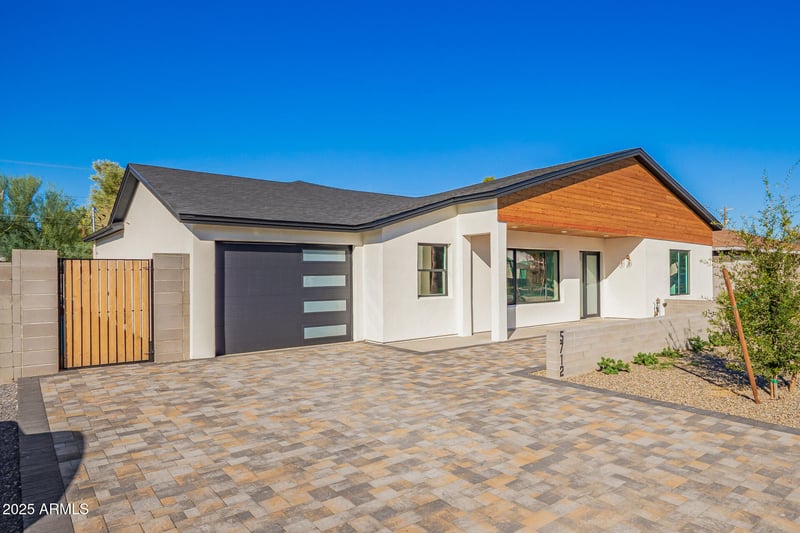 Listing details for 5712 11th Pl, Phoenix, AZ 85014 : This fully permitted new construction home has been rebuilt from the ground up, thoughtfully blending preserved original brick walls and trusses with stunning modern design to create a truly vaulted architectural masterpiece. The living area is ideal for entertaining and flows seamlessly into a custom eat-in kitchen featuring a 36-inch custom gas range, all-new appliances, a coffee bar, wine bar, and abundant cabinetry. The split floor plan offers privacy and flexibility with two primary suite options, including a luxurious primary bath with custom marble walk-in shower. Additional highlights include spray foam insulation throughout and dual AC. Outside enjoy a gorgeous pavered driveway and private courtyard, new landscape, lighting and custom black windows and doors - Truly a MUST SEE!!!