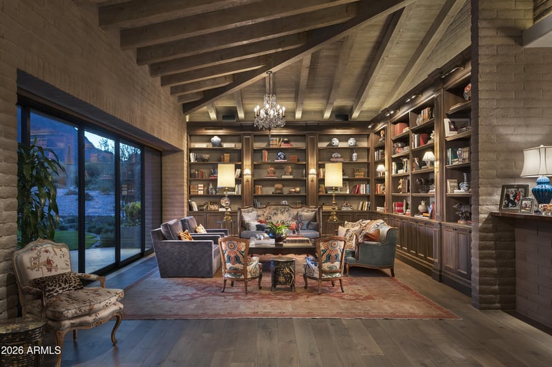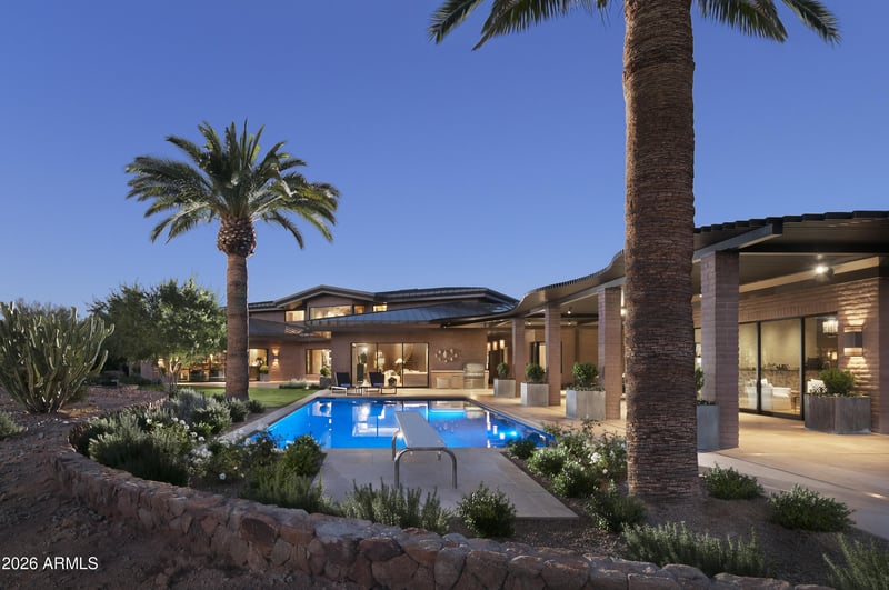Listing details for 5721 Casa Blanca Dr, Paradise Valley, AZ 85253 : On one of Paradise Valley's most coveted streets, this architecturally rich 2.72 ACRE double Gated estate on Casa Blanca Dr. captures the essence of true Arizona living. Framed by full-face Camelback Mtn views the home blends classic design with modern amenities. Built in 2014 and designed by Gerry Jones, this 10,380 sq ft estate is built to last. It has an elegant standing seam metal roof with beautiful slated curvilinear roofline, soaring angled white washed doug fir beamed ceilings, and masonry walls. Outdoors there are man-made berms and an immersive walking path where the landscape is built to mimic the Sonoran desert. There are several large pocketing glass doors in many of the rooms designed for indoor-outdoor living. The multi-purpose 1,185 SF game house includes a large game rm, wet-bar, gym, Moroccan-inspired bathrm and/or a guest suite. The main house features a vaulted library, 2,000+ bottle wine cellar, chef's kitchen with Miele + Wolf appliances, butler's pantry with walk-in refrigerator, and a dining room that seats 20. The primary retreat offers panoramic views, a Japanese inspired bathrm, and tailored dressing rooms. Sitting on 2.72 acres the outdoor living also has extensive patios, citrus trees, rooftop view deck with fireplace, outdoor barbecue, inviting pool, spa, and misting system. This is PV living at its finest elegant, unforgettable, and rarely available!