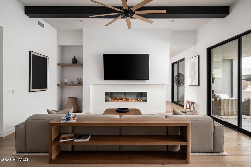 Listing details for 5724 Moura Dr, Cave Creek, AZ 85331 : ORGANIC MODERN SHOWPIECE in the heart of Cave Creek! This stunning home blends clean contemporary lines with warm, natural textures to create a truly elevated desert retreat. Soaring ceilings with exposed wood beams, wide-plank flooring, and an open-concept layout set the tone for effortless luxury living. A designer chef's kitchen features sleek custom cabinetry, dramatic quartz countertops, a large waterfall island, premium stainless steel appliances, and statement lighting. The space flows seamlessly into the expansive great room, complete with a modern linear fireplace and oversized sliding glass doors that invite the outdoors in; perfect for embracing Arizona's coveted indoor/outdoor lifestyle. Separate Office/Den. A large Casita. New Pool. The backyard is a private oasis with an outdoor fireplace, barbecue, clean-lined hardscaping, and lush landscaping; ideal for relaxing or entertaining under the wide-open Cave Creek sky. Thoughtfully designed for both comfort and privacy, the home offers a split floor plan with spacious bedrooms and spa-inspired bathrooms. Primary suite is a serene retreat, featuring freestanding tub, an oversized shower, and a calming, minimalist aesthetic that reflects the home's organic modern design. Additional highlights include a 3-car garage, high-efficiency systems, whole house water filtration system, tankless water heater, and more. Located in one of Cave Creek's most desirable areas, just steps away from the future Lone Moutain Park with pickle ball, tennis, dog park, water play feature and shaded playgrounds, natural trails, and much more.