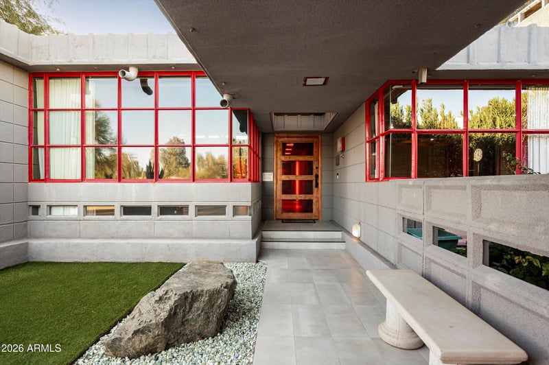 Listing details for 5802 30th St, Phoenix, AZ 85016 : Perched at the 18th hole of the AZ Biltmore LINKS Golf Course on 1.67 acres, The Benjamin Adelman House (original build 1951 by Frank Lloyd Wright himself) is a rare livable work of art - a captivating example of Frank Lloyd Wright's desert-modern genius—a home where architecture, landscape of natural desert/artificial turf & multiple fruit trees, converge in breathtaking harmony. This iconic 4 bed/4,5 bath/(2) guest houses/6-car garage residence commands sweeping fairway views framed by rugged desert mountains and an endless Arizona sky. Constructed using Wright's revolutionary cast concrete Usonian Automatic block system, the home showcases his vision of modular, sculptural design—each patterned block forming a rhythmic tapestry of light, shadows and...(cont'd) texture-both monumental and intimate - offering the extraordinary opportunity to own a piece of architectural historythoughtfully enhanced with modern updates in 2018. Enhancing estate's rarity and livability are (2) guest houses, ideal for hosting visitors, extended family, or creative retreats, along with a (6)-car garage and large motor courta remarkable amenity that complements the scale and prestige of the property. Natural materials, 438 windows, intimate ceiling heights, and purposeful sightlines create a sense of calm sophisticationevery detail intentional, every angle a conversation with the desert. To own the Benjamin Adelman House is to become a steward of a true Frank Lloyd Wright Usonian Automatic treasure, set within the legendary Arizona Biltmore, long celebrated as the "Jewel of the Desert," where historic significance, modern refinement, and an unparalleled setting come together in perfect balance.
