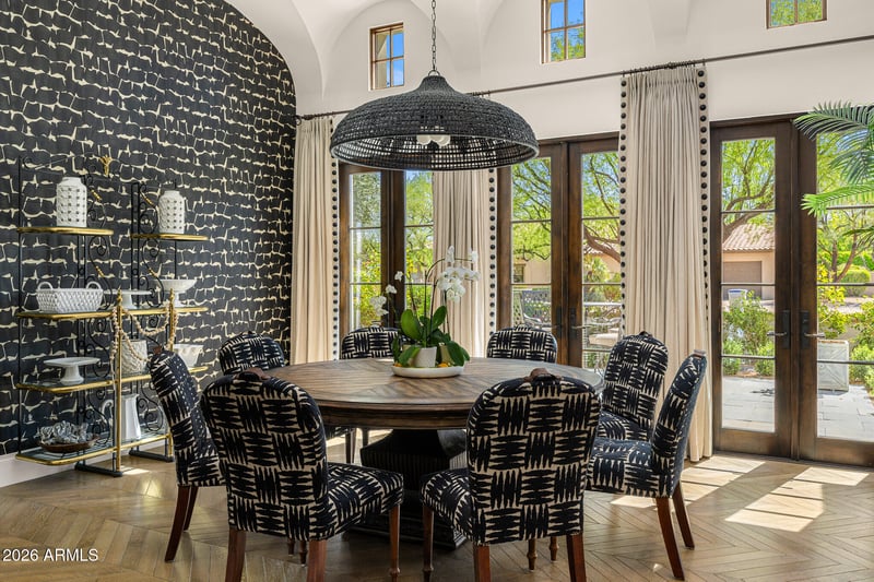 At the heart of the home, the kitchen overlooks a serene courtyard and features custom Desert Cove cabinetry, matte Carrera marble countertops, top tier appliances, and a striking solid walnut island beneath a light filled cupola with a statement chandelier. The space flows seamlessly into the great room, where accordion doors open to covered patios, private gardens, and beautifully curated outdoor living spaces that capture the essence of indoor outdoor living.