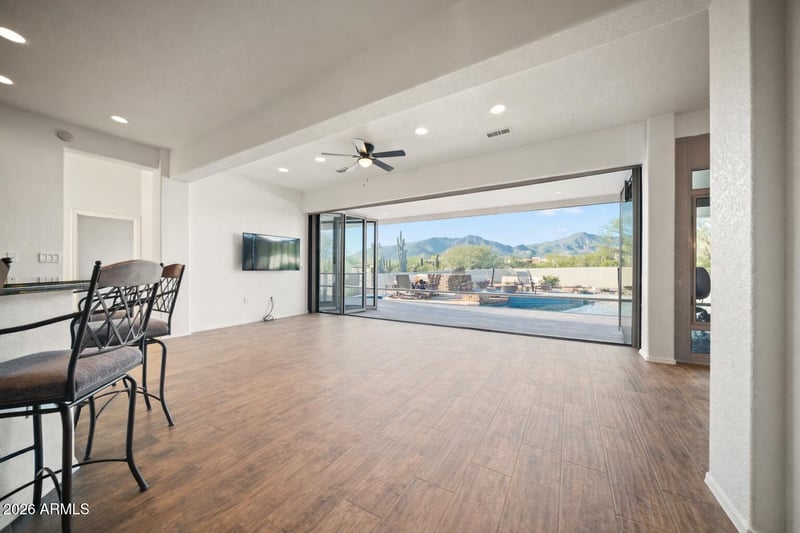 Listing details for 5894 Hidden Springs Rd, Cave Creek, AZ 85331 : Set on 2+ acres with mountain views, this no-step retreat blends comfort, privacy, and exceptional amenities. A new 40'×40' garage with 16' ceilings accommodates 8 cars, paired with a 2-car attached garage—perfect for collectors. The resort-style backyard features a salt water pool, spa, built in bbq, and putting green, all framed by serene desert scenery. Inside are 4 bedrooms, 3 baths, an office, and two versatile bonus rooms ideal for a fitness room, golf simulator, or media space. A dual-sided stone fireplace and owned 22.4KW solar enhance year-round living. New systems, mechanicals, and structures make this home efficient, reliable, and an excellent value. Perfectly located 2 mi. from the entrance to the Tonto National Forest and 2 mi. from the Town of Cave Creek.