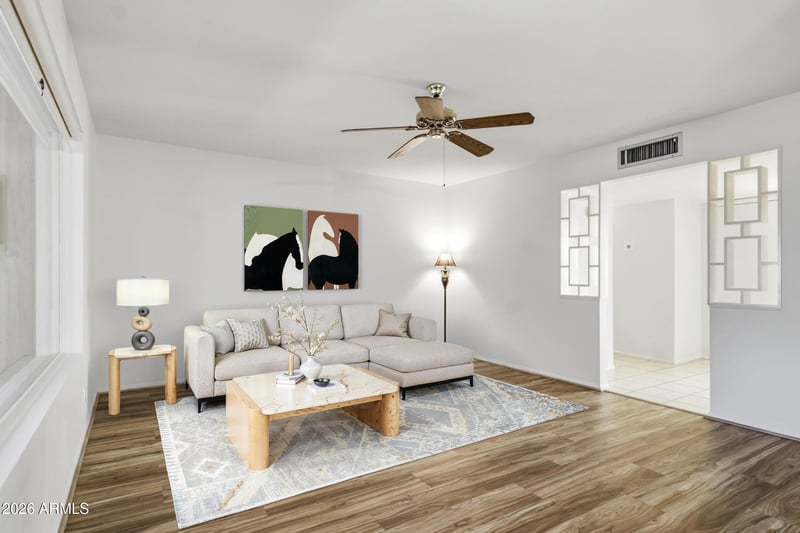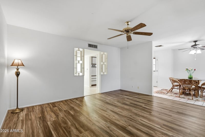 Listing details for 5922 Anaheim St, Mesa, AZ 85205 : Welcome to this 2-bedroom, 2-bath home in the sewer-connected section of Dreamland Villa, a Mesa 55+ community! This move-in-ready home features beautiful fresh interior and exterior paint (both completed in 2025), offering a bright, clean canvas for your next chapter. Relax, unwind, or entertain guests in your spacious Arizona room, perfectly designed for comfortable indoor-outdoor living year-round. The property includes a convenient individual laundry room with the washer and dryer included, plus a backyard with citrus trees for fresh fruit all season long. Enjoy ultimate freedom with Dreamland Villa's optional HOA--join only if you want access to the clubhouses, pools, and endless activities!