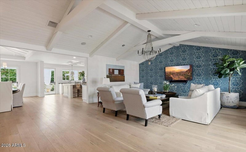 Listing details for 6141 Calle Camelia --, Scottsdale, AZ 85251 : Welcome to 6141 E Calle Camelia--an exceptional Modern Coastal retreat perfectly positioned on a private half-acre lot with breathtaking Camelback Mountain views. Newly remodeled and completed in 2026, this thoughtfully designed estate blends timeless charm with elevated, resort-style living. The property features a 3,845 sq ft main residence plus a 590 sq ft guest house, offering a total of 6 bedrooms and 6.5 bathrooms, with all bedrooms ensuite--ideal for both family living and hosting guests with ease. From the moment you arrive, the home's incredible curb appeal and professionally landscaped grounds set the tone. Inside, vaulted ceilings and wide-plank wood flooring create a bright, airy ambiance, while expansive living spaces seamlessly connect indoors to out. At the heart of the home, the chef's kitchen is designed for both everyday living and entertaining, complete with a large island, abundant storage, and picturesque views overlooking the backyard oasis. The primary suite is a true retreat, featuring a spacious sitting area, direct access to the backyard, and an impressive custom closet. Step outside to experience the ultimate Arcadia lifestyle--an incredible backyard designed for gathering and relaxation. Enjoy the sparkling pool, built-in BBQ, outdoor dining areas, and a cozy outdoor fireplace, all surrounded by lush landscaping and plenty of space to roam. Additional features include an attached 2-car garage plus a detached 1-car garage, all located on a quiet, family-friendly street within the highly sought-after Hopi School District. This is more than a home--it's a lifestyle.