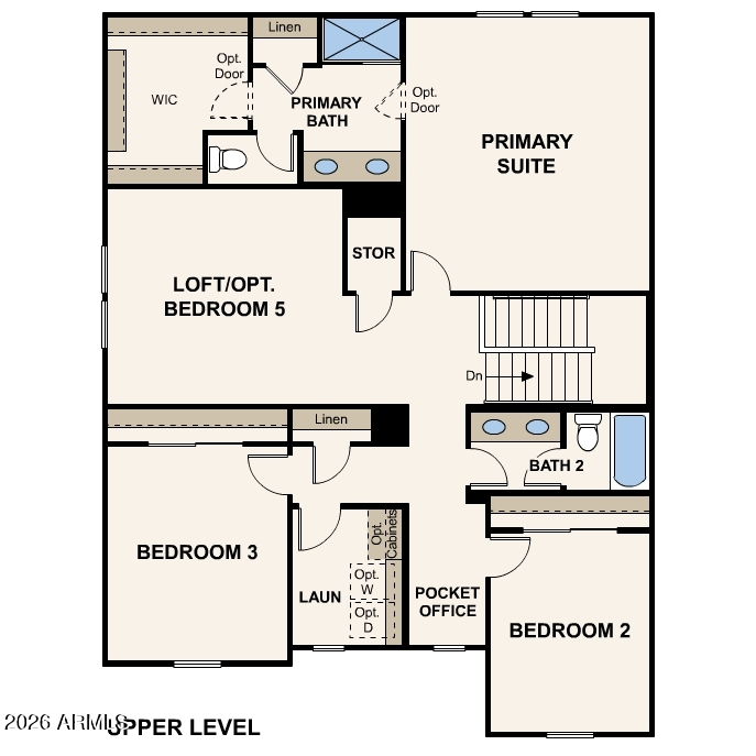Upstairs, a central loft, nearby storage, pocket office and two secondary bedrooms create a functional layout. The primary suite spans the back of the home with peaceful views, a walk‑in closet, and a private bath with flexible design options.