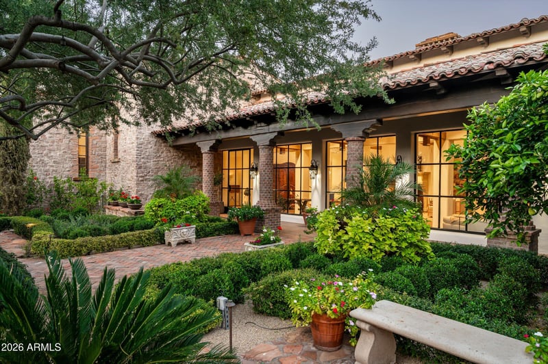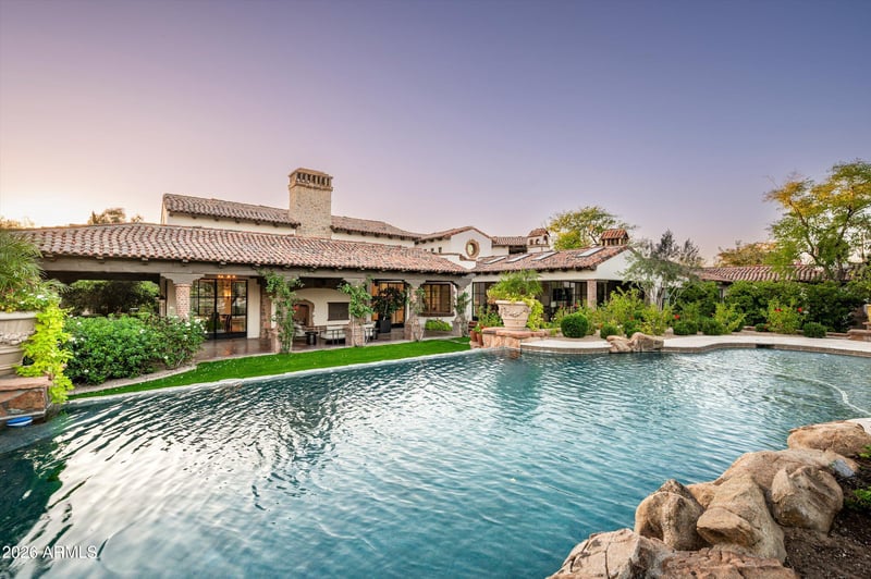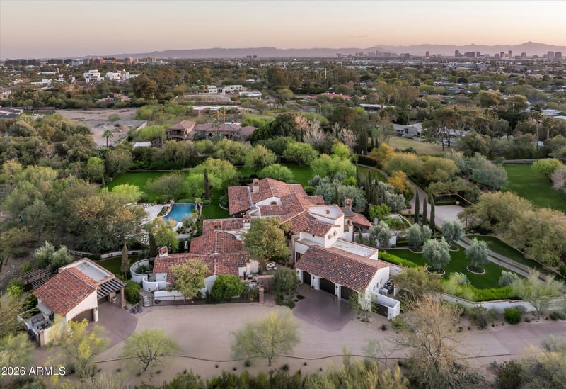 Listing details for 6201 20th St, Phoenix, AZ 85016 : Fully remodeled and masterfully reimagined with interiors by the renowned firm Nate Berkus Associates, this more than 7,000-square-foot residence blends timeless European elegance, impeccable craftsmanship, and curated luxury. Set on expansive private grounds, the estate offers a rare opportunity to experience resort-style living in a home of extraordinary design and refined sophistication. Soaring ceilings and walls of glass fill the home with natural light, highlighting its grand scale and refined architectural detailing. Rich wood and limestone flooring create warmth and continuity throughout, while six hand-carved limestone fireplaces anchor the living spaces and reclaimed wood accents add depth and timeless character. The thoughtfully designed floor plan features four expansive en-suite bedrooms and four-and-a-half baths, each appointed with bespoke materials and elevated finishes. The private primary wing serves as a true sanctuary with two separate primary bathrooms, two generous custom closets, and a secluded courtyard with a private outdoor shower for a tranquil outdoor escape. At the heart of the home, the kitchen pairs beauty and performance. Custom cabinetry, slab marble surfaces, and a dramatic marble-and-bronze island form an architectural centerpiece, complemented by Sub-Zero refrigeration and a statement La Cornue range. A fully equipped secondary kitchen adds exceptional convenience for entertaining or daily living. The fully enclosed grounds evoke the feel of a private resort, with lush gardens, mature roses, vibrant blooms, and citrus trees, alongside a tranquil koi pond and wood-fired pizza oven. Multiple covered entertaining areas, artificial turf, and a dedicated greenhouse enhance both charm and versatility, while the infinity-edge pool, framed by limestone decking and a picturesque pergola, creates an idyllic setting for relaxation and entertaining. Two garages with space for 4.5 cars complete the offering. Located within walking distance of the iconic Arizona Biltmore, this exceptional estate offers a rare blend of privacy, scale, and resort-inspired living.