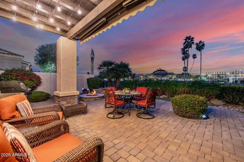 Step outside to a truly special backyard retreat featuring golf and pond views, an extended electric awning, covered patio dining area, gas firepit, and lush, easy-care landscaping an ideal setting for year-round Arizona outdoor living.