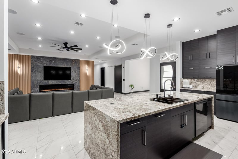 Listing details for 629 Bruner Rd, Buckeye, AZ 85396 : Beautifully built in 2023, this stunning home offers a modern open layout with a spacious kitchen featuring granite countertops, an oversized island, walk-in pantry, and a full laundry room. The primary suite includes a spa-style bathroom with a relaxing jacuzzi tub. The living room features an electric fireplace with a custom granite back wall, complete with built-in cinema audio and an integrated sound system for the perfect entertainment space.