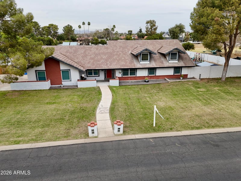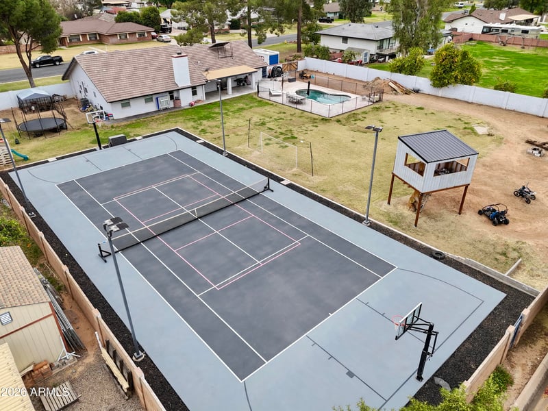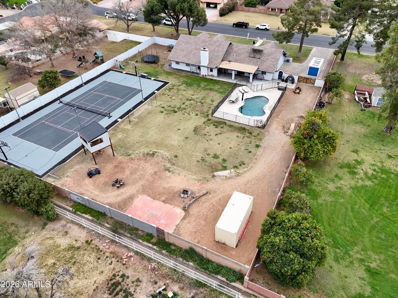 Listing details for 640 Melody Dr, Gilbert, AZ 85234 : Located in the highly sought-after Circle G Ranch community, 640 East Melody Drive presents a super rare opportunity to own nearly an acre in the heart of Gilbert with horse privileges, SRP flood irrigation, and no HOA. Sitting on an expansive .86-acre lot, this property offers the perfect blend of space, privacy, and flexibility -- something that is increasingly hard to find in this area. This single-story ranch home offers 3,000 square feet with four bedrooms, three bathrooms, and a separate den or office, ideal for working from home or creating a quiet retreat. The thoughtful split floor plan provides privacy for the primary suite, while the vaulted living room showcases beautiful beams and a fireplace that adds warmth and character to the home. The kitchen opens seamlessly to the main living areas, making it perfect for entertaining or everyday living. The private primary suite serves as a true retreat, while the additional bedrooms are generously sized and well positioned for family or guests. Throughout the home, you'll find a stunning interior layout that balances charm with functionality. Step outside and you'll discover an entertainer's dream backyard. A covered patio provides shaded comfort for relaxing or hosting gatherings, while the sparkling pool, tree house, dirt bike pump track, and custom multi-sport, sport court (Tennis, full court Basketball, and pickleball) create endless opportunities for fun and recreation. With SRP irrigation and horse privileges, the oversized lot offers incredible potential -- whether you envision space for animals, a guest house, RV garage, workshop, or simply wide-open room to enjoy. All of this is located in a prime Gilbert location close to shopping, dining, and convenient freeway access, offering the rare combination of country-style living with everyday convenience. Opportunities like this in Circle G Ranch don't come around often.