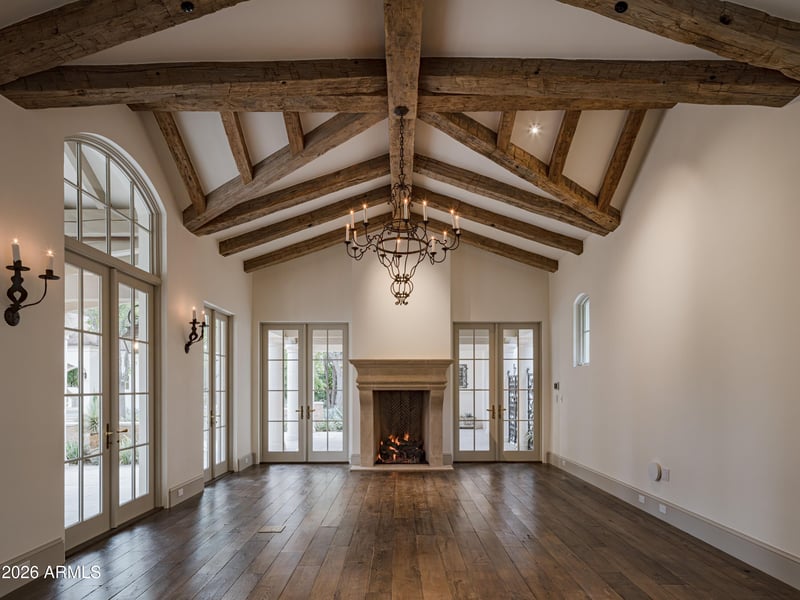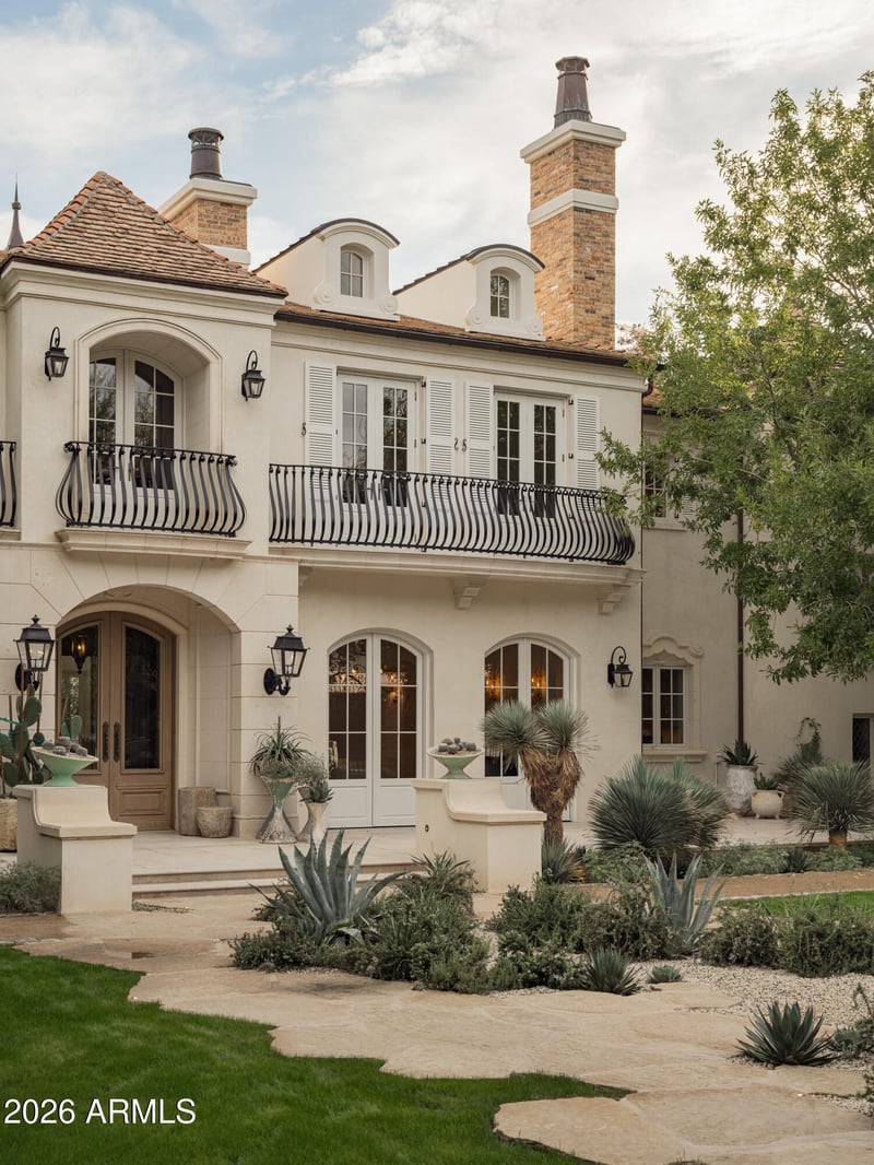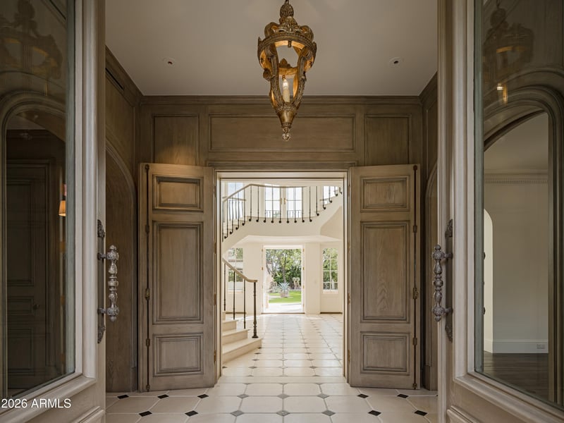 Listing details for 6415 Exeter Blvd, Scottsdale, AZ 85251 : Behind tall private iron gates on the most coveted stretch of Exeter Boulevard, this extraordinary French-inspired Arcadia estate sits on nearly a full acre with commanding street presence, a dramatic fountain arrival, and rare north-south exposure—free of overhead power lines. Designed by architect Mark Candelaria and built by Nance Construction, the residence showcases authentic Old-World masonry construction and timeless European elegance paired with modern luxury. Interiors are defined by elegant archways, grand formal and informal living spaces, and a dramatic dual-foyer stair hall. Reclaimed wood beams, imported limestone and European oak floors, custom millwork, Niermann Weeks lighting, and carved limestone fireplaces with reclaimed firebrick reflect meticulous attention to detail. The chef's kitchen features a statement French range and professional-grade appliances, complemented by an adjacent catering pantry and full bar. Additional highlights include a library, glass conservatory, and climate-controlled wine cellar.