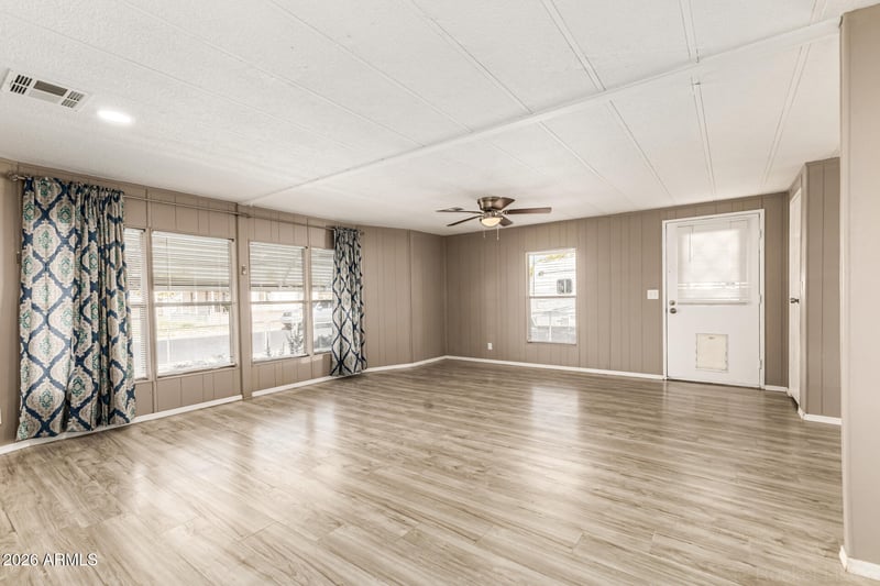 Listing details for 643 93rd Pl, Mesa, AZ 85208 : No HOA, mountain views, and room for your RV and toys! Enjoy wide open Arizona skies from this updated double-wide manufactured home on its own land. Originally remodeled in 2020, the home features laminate flooring, granite countertops, updated kitchen cabinetry, and stainless steel appliances including a gas range, built-in microwave, and dishwasher. PEX plumbing runs throughout the home along with modern LED lighting, updated plumbing fixtures, refreshed vanities, and resurfaced shower/tubs.