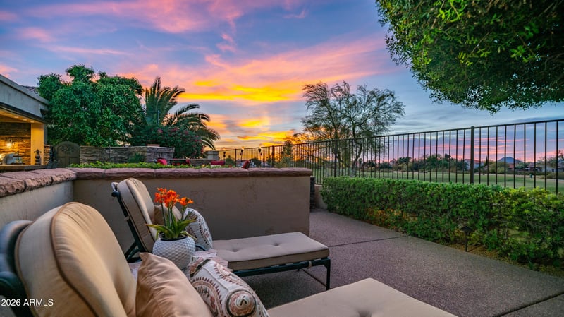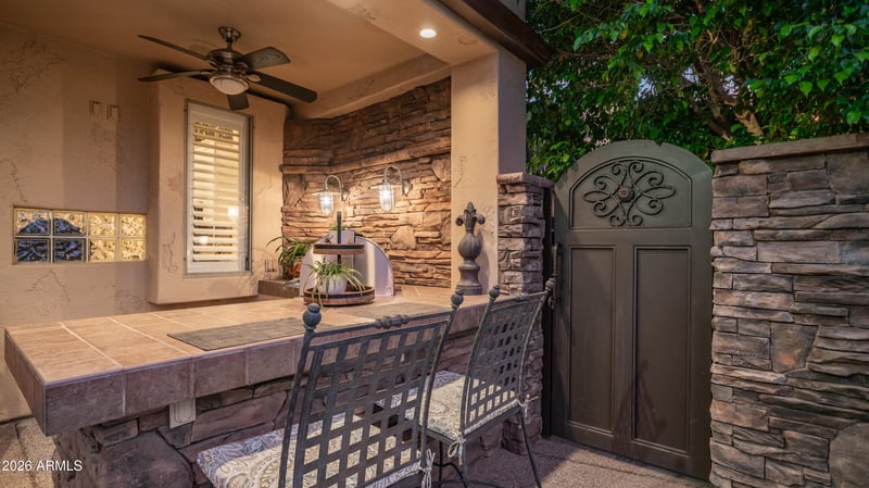 Enjoy weekends spent entertaining or simply relaxing in this serene Mediterranean-inspired retreat, where lush golf course views, the majestic Red Mountain, and stunning Arizona sunsets create a breathtaking backdrop. The garden's charm continues with raised flower beds, a wood-burning fireplace, built-in BBQ, elegant, stacked stone, custom iron gates, multiple seating areas, and a covered patio, an ideal space for both quiet moments and lively gatherings.