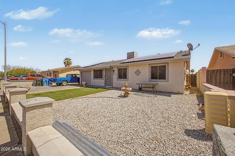 Listing details for 649 69th Ave, Phoenix, AZ 85043 : Check out this charming single-level home in Phoenix! A driveway parking & a low-care front yard w/artificial turf are just the beginning. The inviting interior showcases a neutral palette, recessed lighting, and wood-look tile floors in all the right places. Functional floor plan with a seamlessly flowing living & dining room, alongside a welcoming family room that opens to the kitchen! SS appliances, quartz counters, a walk-in pantry, white cabinets, and an island w/breakfast bar make up the culinary space. The main bedroom has a full bathroom for added comfort. Studio can easily be converted back to garage or keep for income! Laundry room with cabinetry. Large backyard features natural grass, play area, storage shed, and a full length covered patio. Solar is owned. Great location