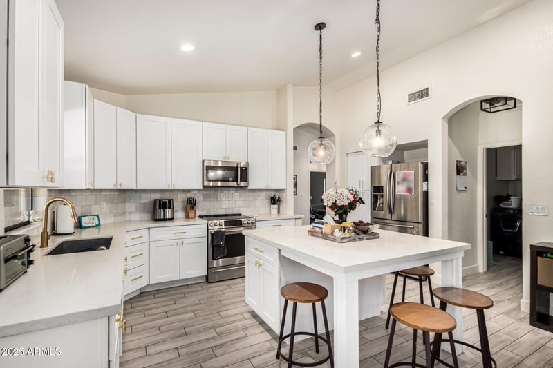 Listing details for 650 Bay Dr, Gilbert, AZ 85233 : Gorgeous 4 BR 2BA 2 Car Garage Single Story w/ a pool located in Bayview at the lovely lake Subdivision the Islands. A paver walkway leads to a double door entry. The front doors open to a formal living space with high vaulted ceilings overhead with decorative built-in niches. A soft color palette runs throughout accented by stylish fans and fixtures. The beautiful kitchen displays white shaker-style cabinets, tile backsplash, quartz countertops, stainless steel appliances, a bay window dining area and an island with a breakfast bar that opens to a living area offering a cozy fireplace. The tranquil main bedroom boasts a closet with mirrored doors, and a private bathroom with double sinks and a separate shower & tub. The den is perfect for a home office, a quiet retreat, gym, craft room or anything really, it's quite spacious! Attached cabinets in the laundry area and garage for added storage. The backyard is complete with an expansive covered patio, a sparkling pool and a grass area for play. Close to schools, dining, shopping and entertainment. Come and see!