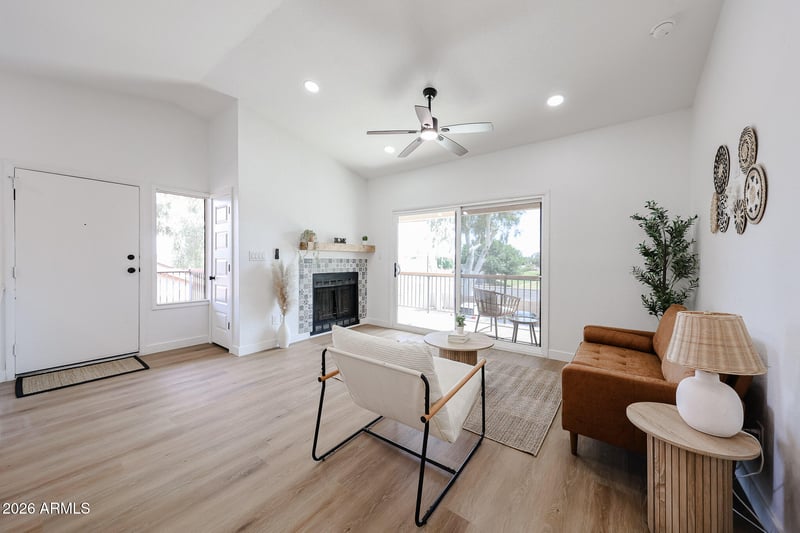 Listing details for 6550 47th Ave #212, Glendale, AZ 85301 : Clean, updated, and ready to go AT AN AFFORDABLE PRICE.. this remodeled townhome checks ALL the boxes! BRAND NEW: white oak-style flooring, paint, baseboards, trim, doors, ceiling fans, and lighting throughout. Super bright & open living space with custom tile fireplace. Remodeled kitchen w/ slim white oak cabinets, quartz counters, stainless steel appliances, and a custom tile backsplash. Both bathrooms are freshly remodeled w/ new vanities, mirrors, showers & tile. The primary bedroom includes a custom wood ceiling accent for a unique flair. In-unit washer/dryer, large front patio, and private balcony with storage. Community has lovely walking paths and POOL! Come check this one out for your self! FHA APPROVED AS OF 4/21/2026!!