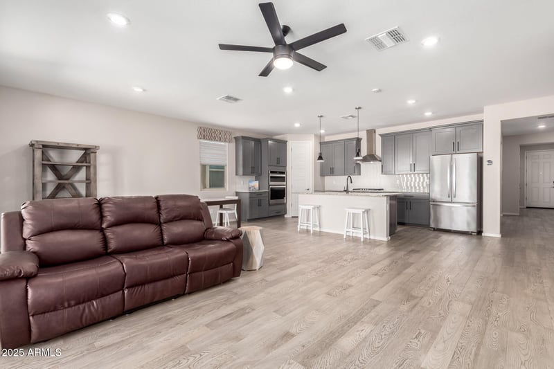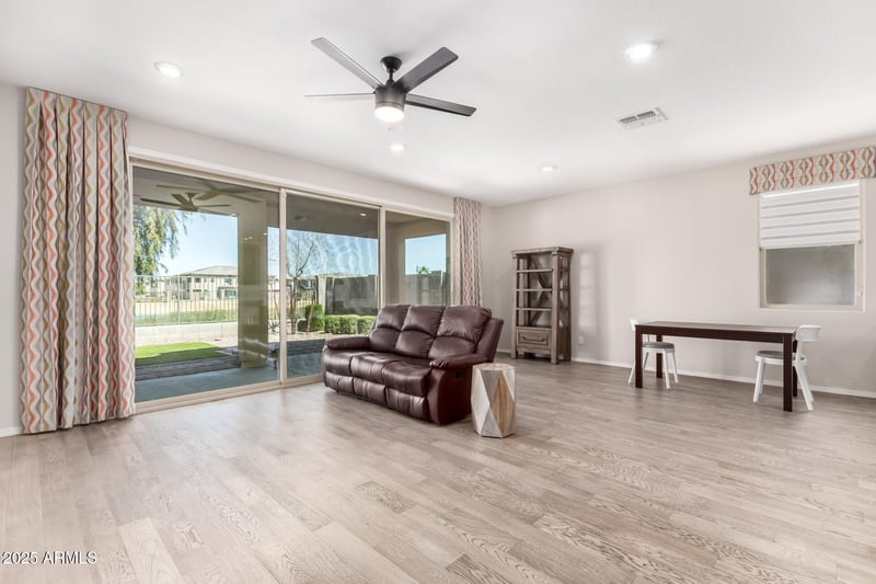 Listing details for 658 Rojo Way, Gilbert, AZ 85297 : Incredible lake-view property in the highly sought-after Layton Lakes community! Former model home packed with upgrades and designer touches throughout. Stunning curb appeal with manicured desert landscaping in the front yard and pavers, and turf in backyard. This 4 bed, 2 bath home offers an open-concept layout with vinyl plank flooring, abundant natural light, and a soothing color palette. The chef's kitchen shines with shaker cabinetry, granite countertops, pantry, built-in appliances, and a large island perfect for entertaining. Spacious primary suite features a walk-in closet, dual sinks, and walk-in shower. Multi slide Arcadia Door takes you out to the Covered patio overlooking serene lake views. Enjoy parks, lakes, playgrounds, and scenic walking paths. Exceptional Value!