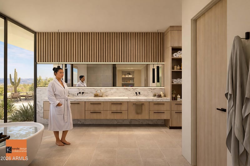 Listing details for 6612 Hummingbird Ln, Paradise Valley, AZ 85253 : Designed by renown architect Brent Kendle this home is being constructed to harmonize with its natural surroundings, while making its own bold statement. Hummingbird Residence exploits the natural grandeur of the desert wash traversing the site, while walls of glass and soaring roof forms reach out to capture mountain views. Social, family and entertainment zones are separated from peaceful private bedroom zones via a dramatic curved indoor bridge spanning the desert wash. A curved wall of glass welcomes views of nature and the infinity-edge pool along one side of the bridge while a gallery wall boasting artfully placed slots of natural light adorns the opposite side.