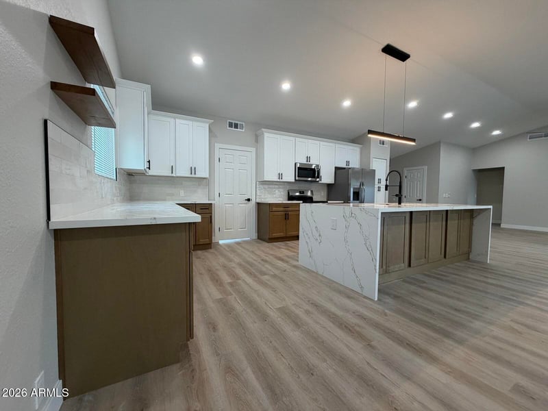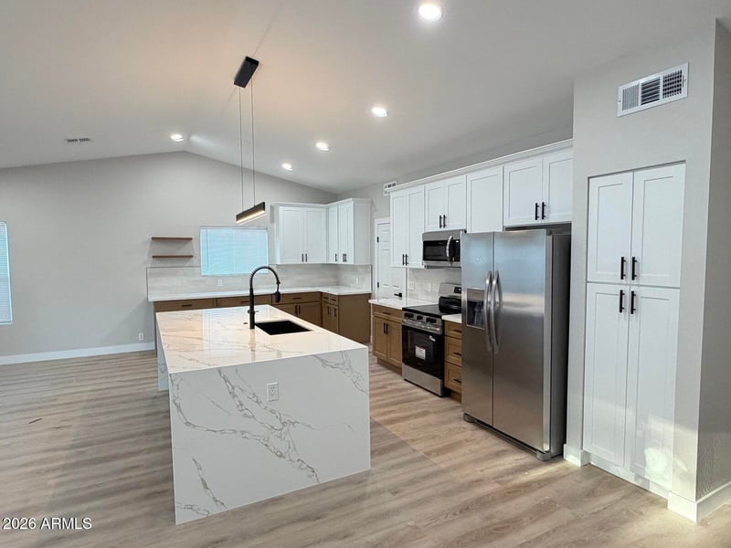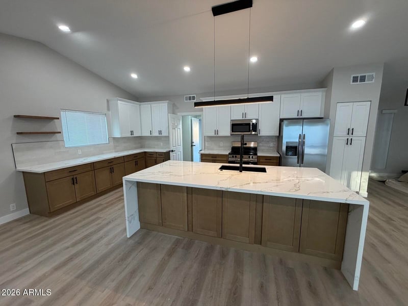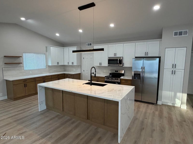 Listing details for 6726 79th Ave, Glendale, AZ 85303 : Welcome to your new REMODELED Home! 4 BEDROOMS, NO HOA, this SINGLE LEVEL home blends modern elegance with everyday comfort. OPEN Floor Plan with a LARGE Family Room and Kitchen is perfect for Entertaining. Breathtaking wall of sliding glass to look out onto the beautiful private back yard and sparkling pool. Thoughtful DESIGN throughout that features ALL NEW FLOORING, NEW BASEBOARDS, NEW ROOF, NEW WINDOWS. NEW DOORS, NEW KITCHEN CABINETRY, FANTASTIC NEW QUARTZ with OVERSIZED WATERFALL ISLAND, DESIGNER TILED BACKSPLASH & NEW STAINLESS appliances. NEW BATHROOMS, NEW INTERIOR PAINT, NEW LIGHT FIXTURES AND DOOR HARDWARE. Located in a Well-Established neighborhood close to Westgate Entertainment Center, Cardinals Stadium, Desert Diamond Casino, Heroes Park & Library, and the Loop 101.