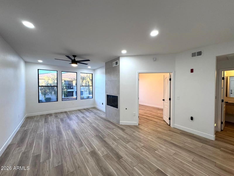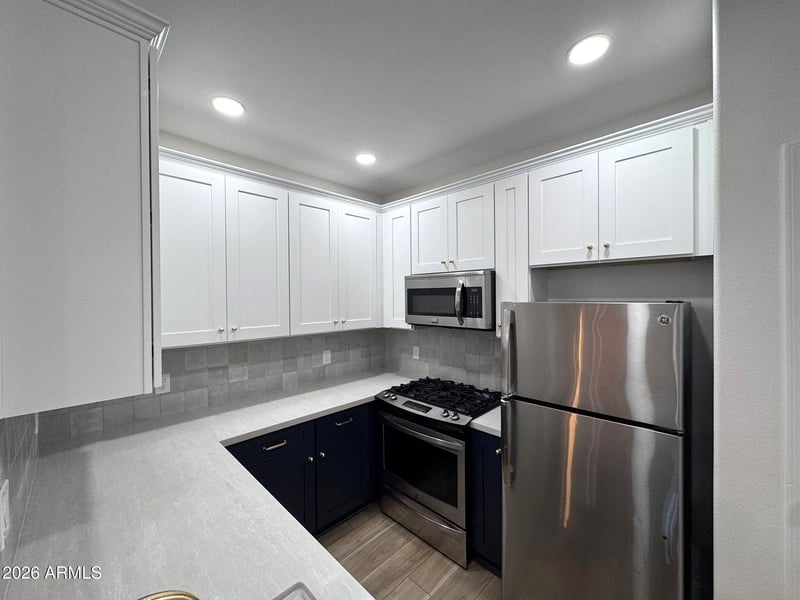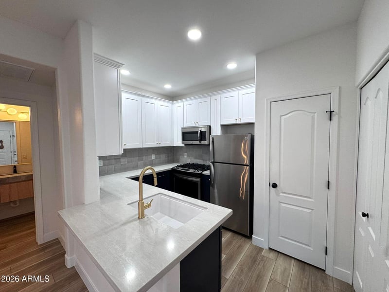 Listing details for 6900 Princess Dr #2117, Phoenix, AZ 85054 : Beautifully remodeled condominium featuring high-end finishes and contemporary design throughout. The kitchen showcases stainless steel appliances, two-tone shaker cabinetry, quartz countertops, and a convenient breakfast bar. Modern lighting fixtures and vinyl wood flooring create a bright, open flow throughout the home. The bathroom is thoughtfully updated with premium shower system, custom vanity, framed mirror, and designer tile niche. The community features a recreation center, heated spa and swimming pool, and workout room.