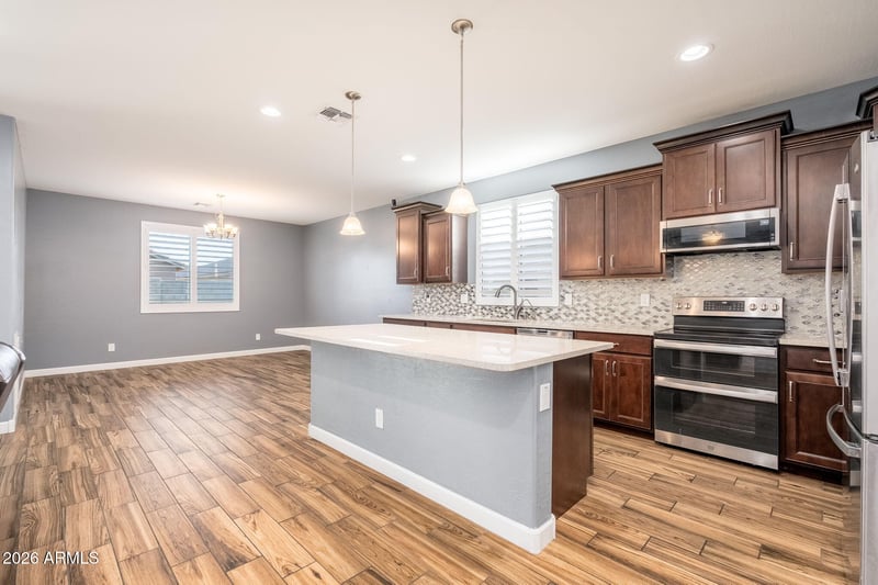 Listing details for 6927 Puget Ave, Peoria, AZ 85345 : Gorgeous, move-in ready, upgraded 2020 home with everything on your buyer's wish list! As you enter you will love the porcelain tile flooring, plantation shutters, and the wide open great room that is perfect for gatherings. The kitchen serves as a true centerpiece featuring a spacious middle island, matching stainless steel appliances, quartz countertops, mosaic tile backsplash, wood cabinets with crown molding and a walk-in pantry. The primary suite is the perfect retreat with a soaking tub, shower, dual sinks, and a walk-in closet. In the private backyard oasis the new, sparkling pool takes center stage, offering an ideal space to cool off on warm, summer days while the surrounding low-maintenance turf provides a lush, green space. Walking distance to the neighborhood park & playground