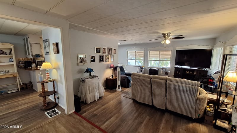 Listing details for 6960 Peoria Ave #37, Peoria, AZ 85345 : Set in a vibrant neighborhood, this charming mobile home offers a perfect mix of comfort and functionality, featuring beautiful LVP throughout. The welcoming living room is ideal for unwinding, while the family room is complete with a wet bar and workspace it creates a great spot for hosting or staying productive. The kitchen is both stylish and practical, showcasing white cabinets, built-in appliances, a wall oven, a tile backsplash, and polished countertops. The primary bedroom serves as a peaceful retreat with its own private bathroom and dual sinks. Enjoy quiet moments outdoors on the covered patio, plus take advantage of community amenities like a relaxing spa and fitness center.