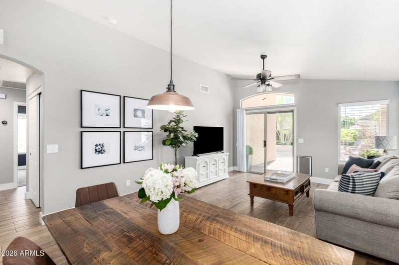 Listing details for 6969 Aire Libre Ave, Peoria, AZ 85382 : If you've been looking for a perfect move-in ready home, this is it! All the work is done already, you just have to start making memories! Enter into a serene living room with vaulted ceilings, stylish tile flooring, & gorgeous kitchen that features quartz counters, crisp white cabinetry, pendant lighting, SS appliances, & a pantry. Imagine enchanting evenings in the lovely backyard, with a covered patio, pavers, pristine artificial turf, and beautifully landscaped garden for true outdoor relaxation. Just minutes away from Harkins Theater, Mariners Spring Training, 3 Fox Restaurants (Postino, North Italia, Blanco), P83 entertainment district and the 101 Hwy. AMAZING walking & biking at Skunk Creek Trail moments away! Solar Panels are OWNED, Roof was replaced in 2019. Come tour it today!
