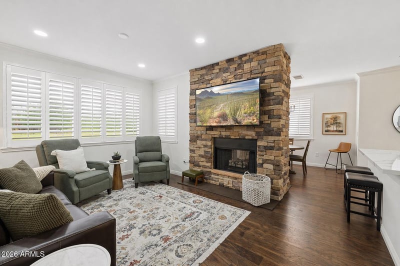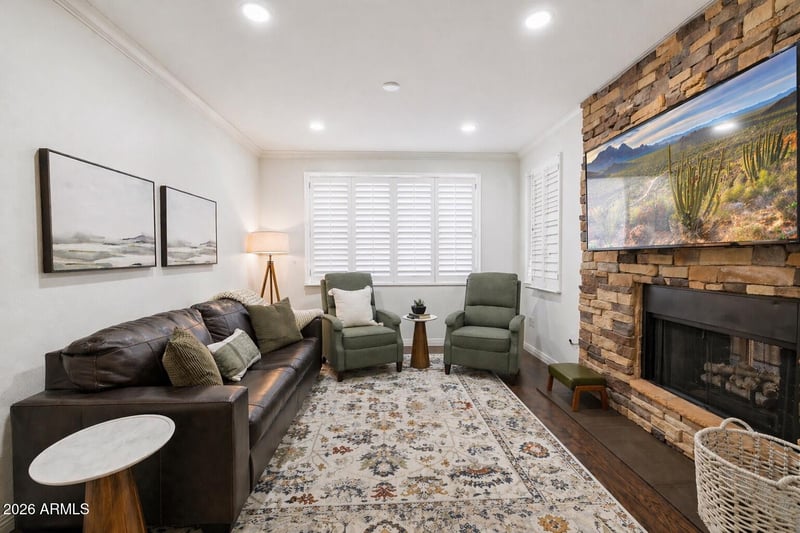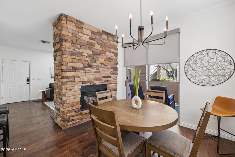 Listing details for 7009 Acoma Dr #1168, Scottsdale, AZ 85254 : Remodeled in March of 2026. 1st level, 2 bed 2 bath. 2 masters, both w/ attached bathrooms, & walk in closets. $35,000 in upgrades including, new shutters, new kitchen cabinets, new granite countertops, full interior repaint, new lighting, new kitchen flooring & reverse osmosis drinking water system. Formal dining room w/2 -way wood burning fireplace. Separate laundry area & coat closet. Private patio w/ storage closet facing East looking over grass. Unit comes w/1 covered parking spot. Premier Scottsdale location, 2 blocks of Kierland Commons featuring upscale shopping & dining. Gated community w/ 2 pools, spa, bbq grills, gym, golf putting green, business center, pool table, ping pong, community kitchen. Hoa dues include water, sewer trash/pest control, roof replacement/repair.