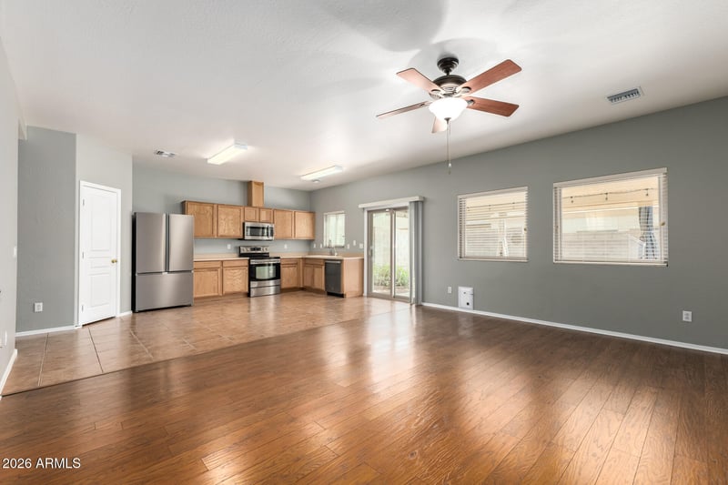 Listing details for 7011 Mercer Ln, Peoria, AZ 85345 : Immaculate 4 bedroom, 3 bathroom home with owned Solar in the Townsend Square gated community. Community pool and park for family enjoyment! Home was repainted inside and out in 2022. All windows were replaced for energy savings! Updated bathrooms. Long driveway offers plenty of parking space. Two car garage. Step into the home and see a wide great room with beautiful wood and tile flooring. There is an electric fireplace which stays with the home, perfect for winter nights. Doggy door gives your pets outside access. The open kitchen concept has ample countertop space. R/O system under sink. All stainless steel appliances , the refrigerator stays with the home! There is a walk-in pantry for all your canned goods. Heading towards the garage you will find a downstairs bedroom, perfect for guests. Across conveniently is a full bathroom. There is an inside laundry room, washer and dryer are included. The roomy garage features a water softener system, overhead storage, and a NEMA- 14-50R charger. Water heater was replaced in 2023. Upstairs has a solar tube which illuminates the top of the stairwell with natural light, and a second bedroom with a walk-in closet, perfect for an office. On the opposite side is a full bathroom. Deep hallway closet. The third bedroom is at the end of the hall. The primary bedroom offers a cozy electric fireplace, and a private ensuite with a separate walk-in shower and soaking tub. Large walk-in closet. This calming backyard offers a large alumawood extended porch with pavers and concrete. HVAC fan unit is extremely quiet. Brand new solar inverter was replaced in 03/26. Great location near shopping, dining & spring-training venues! Come see this home today!