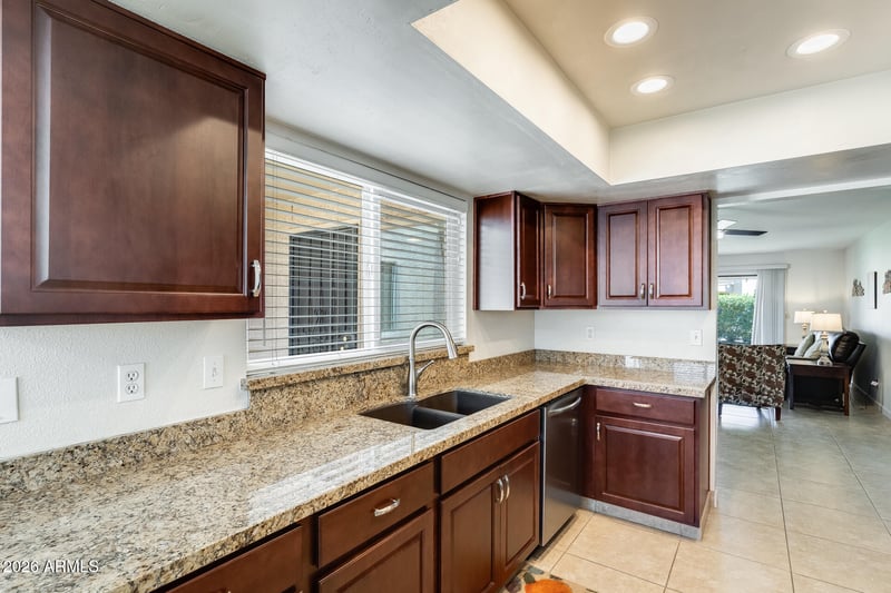 Listing details for 723 Palo Verde Way, Mesa, AZ 85208 : A Must See & Motivated Seller! This upgraded home in the desirable 55+ Mesa community, Fountain of the Sun, includes a thoughtfully designed kitchen with granite countertops, stainless steel appliances, pantry space & a cozy eat-in area. Seamlessly opening into the living room, where sliding doors with custom patio blinds lead to the covered back patio overlooking the community pool. The primary bedroom offers its own private patio access, with custom room darkening blinds, an ensuite featuring a granite vanity, separate room for the shower & toilet, plus a walk-in closet. The other full bath was also updated with a granite countertop vanity. A good sized front patio for outdoor relaxation. Fountain of the Sun provides a wealth of amenities including a clubhouse, multiple pools & spas, pickleball & bocce ball, golf course, workout facility & all within a secure, guard-gated community with quick access to Loop 202, US-60, dining, shopping & nearby recreation. Extra available guest parking located behind the unit with trees blocking the view of cars.